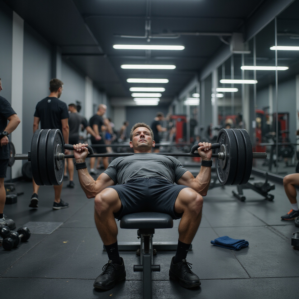 Mężczyzna wykonujący ćwiczenia na ławeczce treningowej, zwracający uwagę na prawidłową technikę i postawę.
