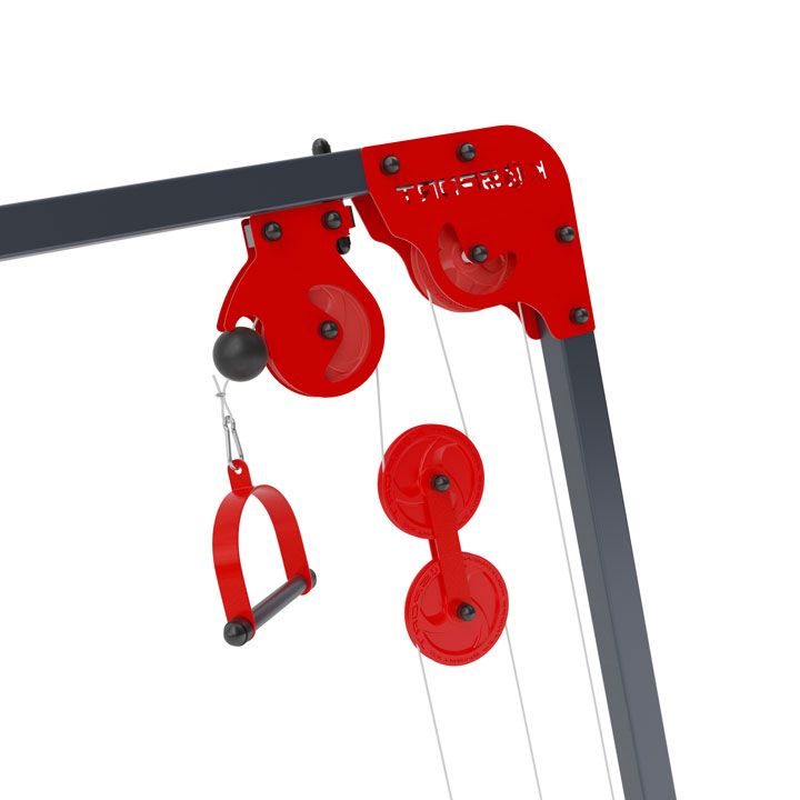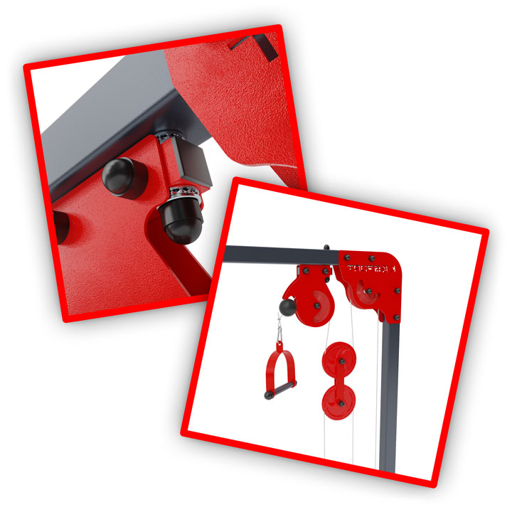 Wykorzystując górne uchwyty obu stron wyciągu, wykonasz precyzyjne ćwiczenia na klatkę piersiową (np. rozpiętki) lub bicepsy (np. zawiadowca). Z kolei przy użyciu dolnych uchwytów obu wyciągów, możesz wszechstronnie trenować barki.
