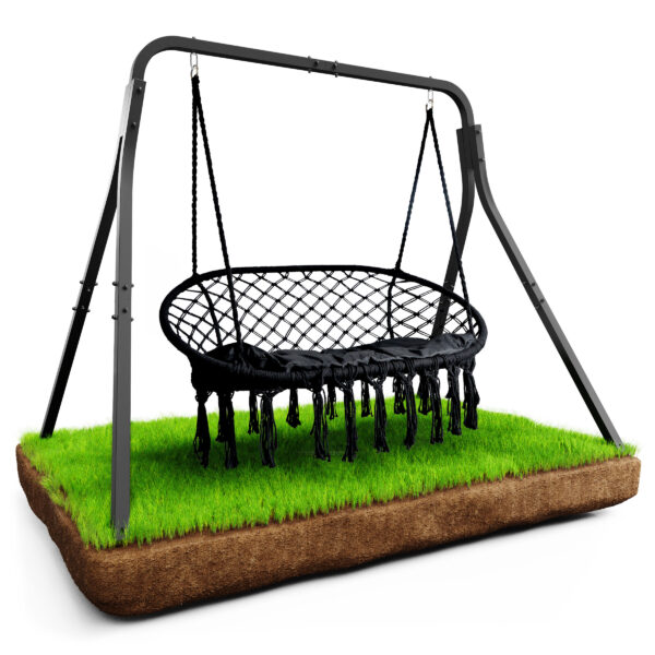 Zawieszenie huśtawki opiera się na grubych linach i solidnych stalowych pierścieniach, które łączą design z bezpieczeństwem użytkowania. To nie tylko dekoracja – to zaproszenie do codziennego relaksu.